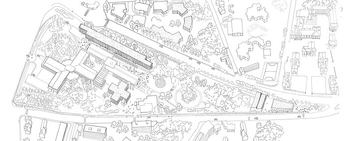 Le site profite d’une localisation privilégiée, proche de la forêt domaniale de Saint-Germain-en-Laye, d’infrastructures ferroviaires et routières, du centre-ville et de la nouvelle ligne de tramway T13. Il permet le dialogue entre le tissu pavillonnaire, une végétation riche et un patrimoine paysager et architectural remarquable. Il nous a paru primordial de respecter l’identité du parc tout en favorisant des interactions entre les différents « bâtiments-objets » présents sur le site, dont le château Saint-Léger (1886) réhabilité par Dominique Perrault en 1991 et le bâtiment coconçu par Jean Prouvé et René Coulon en 1952. En effet, l’idée du parc devient encore plus manifeste avec les aménagements paysagers. La composition végétale réintroduit l’image romantique tandis que des lieux d’échanges se façonnent sous différentes formes d’espaces extérieurs.