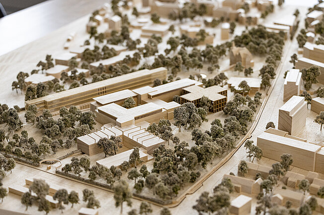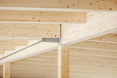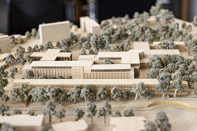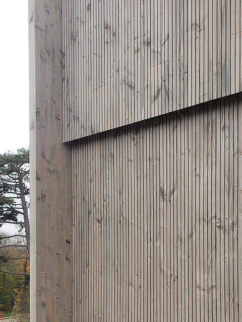Les surélévations reposent sur les toitures-terrasses des ailes A et B et se connectent aux niveaux inférieurs existants, par leur structure et leurs noyaux de circulation verticale. Elles se façonnent dans la continuité des corps de bâtiments existants, en étendant la géométrie des pilastres habillés en pierre. En retrait des acrotères conservés, elles proposent un geste léger et délicat pour minimiser les appuis sur les constructions des ailes A et B. Un système de poteaux moisants et de poutres moisées en bois fin rythme les façades. La structure et le système menuisier se dédoublent de la trame du bâtiment Prouvé et Coulon, conférant à l’élancement du dispositif. L’emploi du bois pré grisé apaise l’aspect contrasté des façades existantes et s'accorde à son contexte densément boisé.