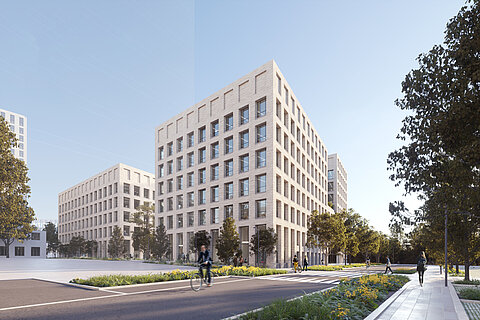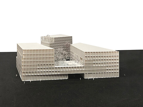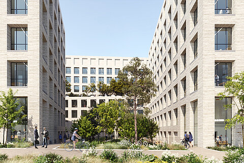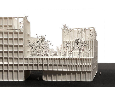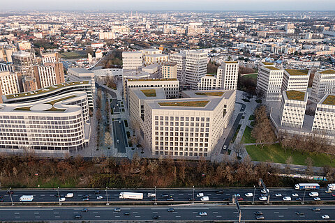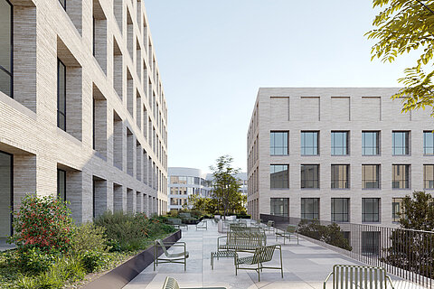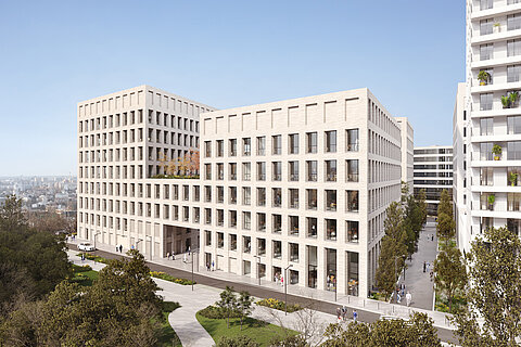 Des espaces extérieurs végétalisés complètent la composition. Un grand jardin est créé en cœur d’îlot où la communauté des usagers se croise, se parle, se repose et crée des liens. Le projet offre également une terrasse accessible à tous depuis le niveau R+4 de près de 900m². Véritable espace fédérateur, il permet aux utilisateurs des trois entités d’accéder à un espace végétalisé en hauteur, offrant des vues sur le jardin comme sur le grand paysage. Ces espaces verts deviennent le théâtre quotidien pour travailler et vivre ensemble.