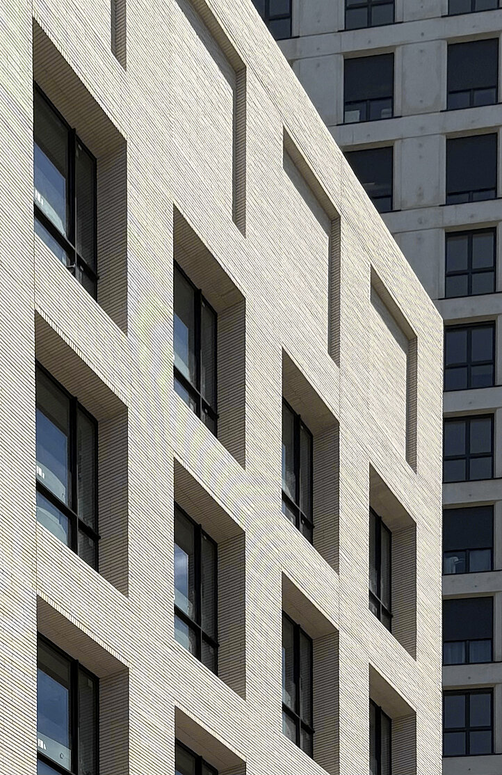 L’enveloppe du bâtiment affiche une écriture régulière (une trame de 360cm) avec des ouvertures généreuses. La matérialité sobre, claire et lumineuse de la brique contraste avec les couleurs plus sombres et mates des menuiseries en aluminium et du vitrage.